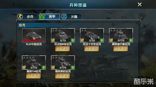 部队图鉴根据部队类型共分为三类,包括步兵、装甲、火炮。