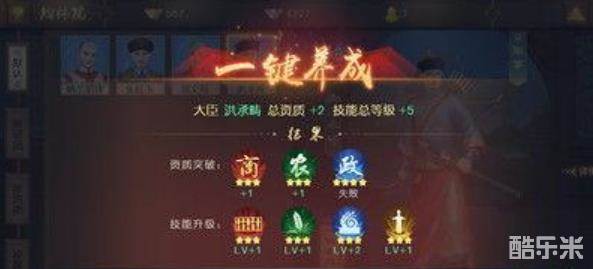 1、一键养成操作只针对大臣“成长点突破”和“技能点升级”两项功能。