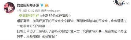 1月14日中午阴阳师官博发出这一样一段文:“全新sp式神猜想:暖阳高照,微风轻拂下的平安京安宁静谧。而即使是这样的平安京,也曾遭遇过一场非常可怕的风暴。”我想在ssr中与风关系密切的也就只有大天狗、一目连了,而大天狗已经出过sp了,剩下的就是风神一目连了。