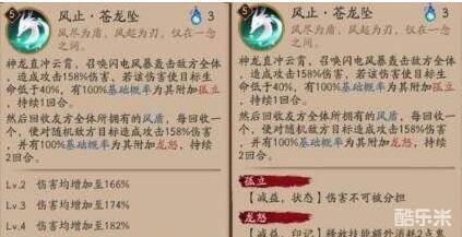 效果:神龙直冲云霄,召唤闪电风暴轰击地方全体,造成攻击158%伤害,若该伤害使目标生命低于40%,有100%基础概率为其附加孤立,持续1回合。