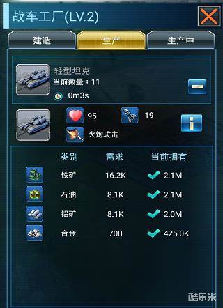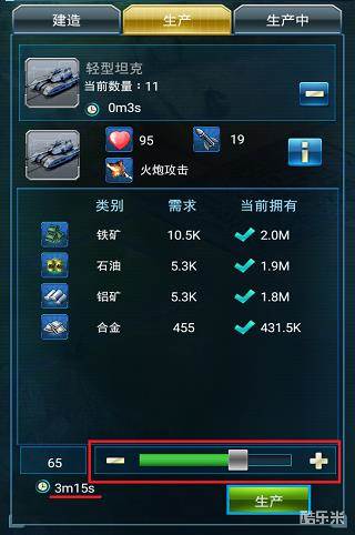 在了解了坦克的具体细节之后我们就可以在进行生产了,通过底部的横条我们可以选择将要生产的单位数量,生产的数量越多,所需要的时间也就越多,点击“生产”之后我们就可以安心的等待坦克完工啦!