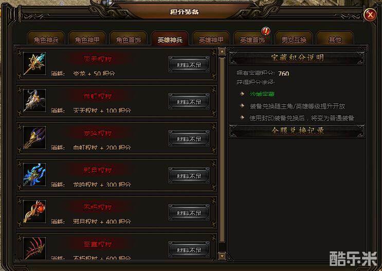 积分装备英雄神兵一栏中,一共有六套首饰。它们分别为灭天权杖(随英雄职业不同而改变)、血虹权杖、龙吟权杖、邪月权杖、不朽权杖以及至尊权杖。