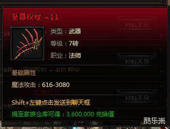 至尊权杖。法师装备。7转以上装备。魔法攻击提升616-3080点。