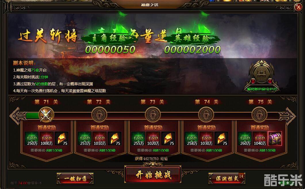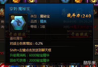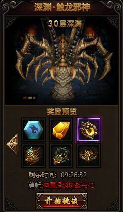 深渊·触龙邪神进入时需要消耗神魔深渊挑战书1本。挑战书可以在神魔秘境中刷。掉落的宝物分别是(并不是一定掉,有些宝物是含概率掉落的):穿刺·魔秘宝(精良)、秘宝精华(中)、BOSS精华(中)、龙吟战盔(2转)、龙吟战链(2转)、龙吟战带(2转)。其中最极品的自然属于穿刺·魔秘宝了。作为品质精良的魔秘宝,它能在PK时给玩家带来对战士伤害增加0.2%的效果。如果打出实属不易,玩家多多珍惜。