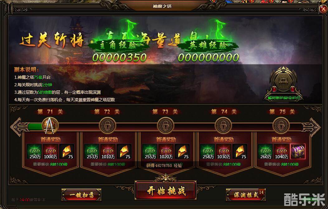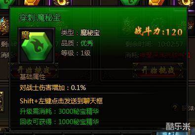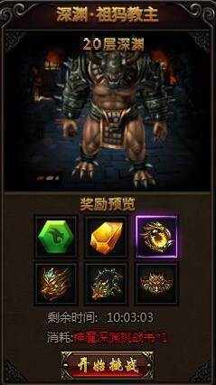 深渊·祖犸教主进入时需要消耗神魔深渊挑战书1本。挑战书可以在神魔秘境中刷。掉落的宝物分别是(并不是一定掉,有些宝物是含概率掉落的):穿刺·魔秘宝、秘宝精华(中)、BOSS精华(中)、龙吟战盔(2转)、龙吟战链(2转)、龙吟战带(2转)。其中最极品的自然属于穿刺·魔秘宝了。作为品质优秀的魔秘宝,它能在PK时给玩家带来对战士伤害增加0.1%的效果。如果打出实属不易,玩家多多珍惜。