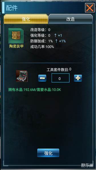 ⑥ 强化:通过强化可以提高配件的各项属性,会消耗水晶,同时会伴随一定的失败几率,各位可要攒好人品哦!