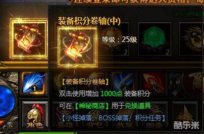 装备积分卷轴(中)。25级,装备积分卷轴。双击使用增加1000点装备积分,可在【神秘商店】中用于兑换道具。