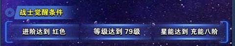 首先,要开启全新的战士觉醒系统需要满足一定的条件:进阶达到红色,等级达到79级,星能达到充能八阶。在同时满足了这三个条件之后,我们就可以点击进入觉醒来给战士进行下一步的提升了。