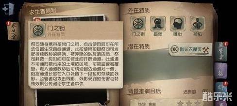 1、祭司现在一开场就有一个门之钥,所以不要再去拖时间等门之钥刷新。祭司单独使用门之钥还是跟以前一样,直接在墙壁上开窗就好。但是要注意监管者会攻击门之钥,所以祭司必须在安全距离使用门之钥,否则祭司会因为门之钥被监管者破坏而晕眩。