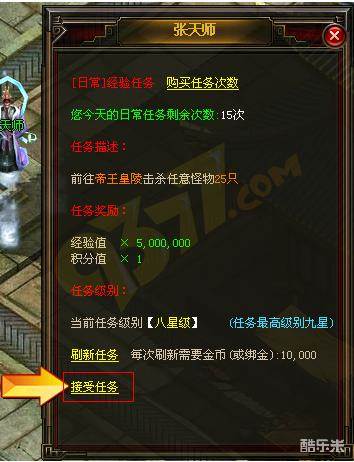 51级任务做完后,需要玩家去升级达到53级才能后续任务。这时我们可以到赤月皇城的张天师接取每日经验任务(图7),利用多倍提交或者购买每日经验的次数来进行升级。还可以到荒漠城进行经验副本的挑战(图8),次数不够时还可以进行购买。