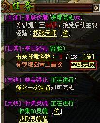 当我们到达43级时,主线的任务就会有每日的任务出现,在赤月皇城的张天师接取每日经验任务可以获得大量的经验(图5),不想刷怪的玩家,可以直接点击立即完成(图6)(需要懒人卷轴,可以在商城和在线里面获得),进行几次每日后升级到44级,接着进行进行主线任务。