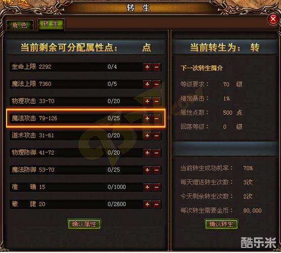 达到60级,可以进行次转生,在人物角色的转生面板可以进行一转,一转成功后可以获得属性点,可以随便加,建议很好按照系统推荐进行加点(图10)。接下去这时候有2种选择,1是继续死命冲级,2是开始打装备。我个人推荐如果你是道士的话可以去各种BOSS洞里蹲BOSS刷装备,因为道士打BOSS有天然优势,如果你是法师或者战士,建议直接死命冲级先不要管装备,一口气冲到70领二转冲级奖励再说。因为这2个职业打BOSS比较难对技术要求比较高,新手朋友可能难以适应,其次到了后期实力提高了再去刷也是可以的并不会太多的影响升级速度。