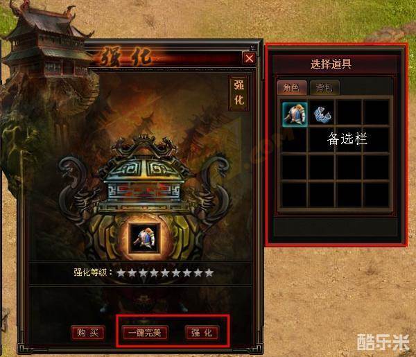 用鼠标左键或右键点选备选栏内的可强化装备,选择强化或一键强化,即可获得一件强力装备。强化完后,属性将会得到提升。