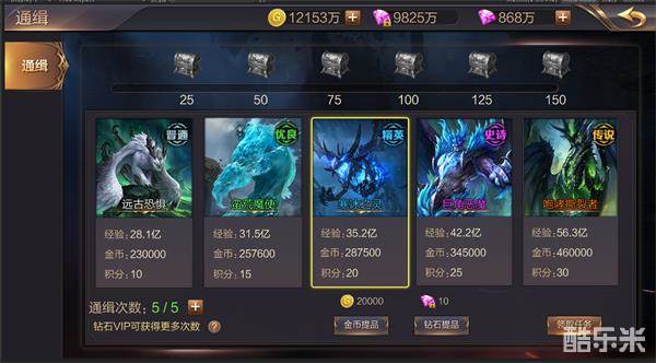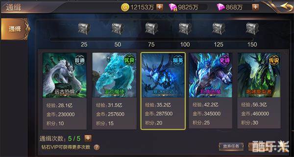 2.玩家可通过金币或钻石提高通缉任务品质,品质越高,怪物强度和奖励都相应提高。