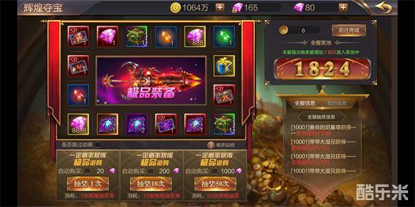 抽奖分别由1次、10次、50次选项,抽奖过程中除了随机获得装备和道具奖励,根据奖池越高,可以获得钻石返还越多。