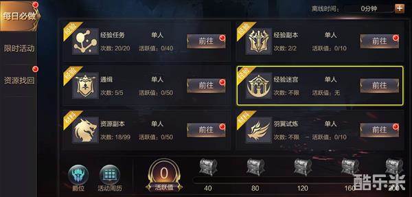 日常活动中有大量的玩法:主要分为每日必做,限时活动,资源找回。完成活动后可以活的对应的活跃值,还有额外的奖励哦。