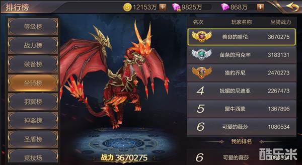 排行榜目前分为等级榜、战力榜、装备、坐骑榜、羽翼榜、神器榜、圣盾榜、竞技场等8种榜单。