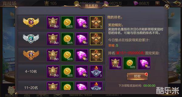 1.玩家可在竞技场界面点击挑战奖励,查看各排名段的奖励和领取每日的竞技场排位奖励。