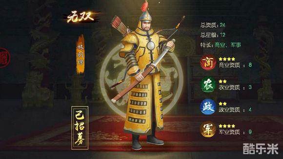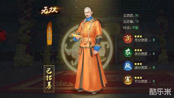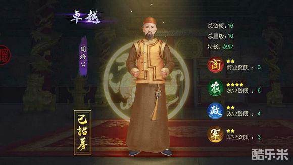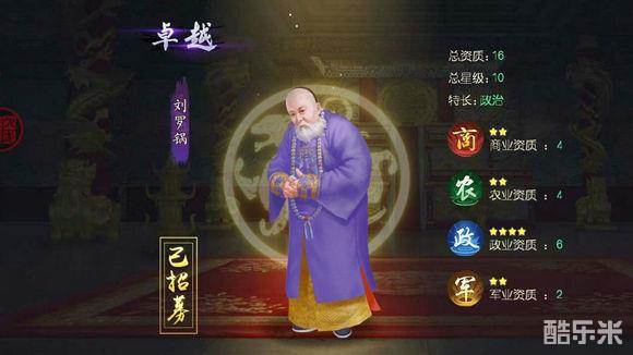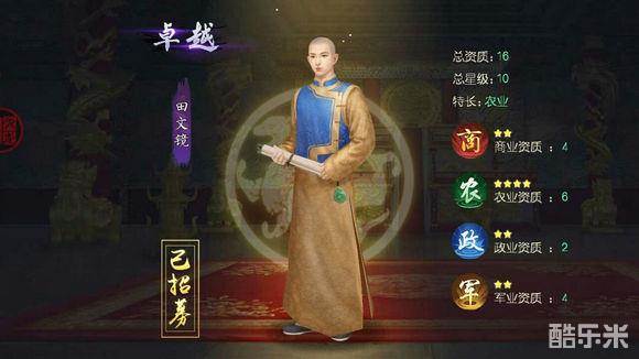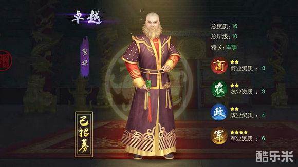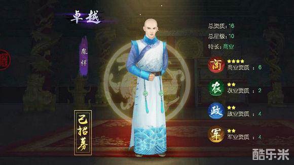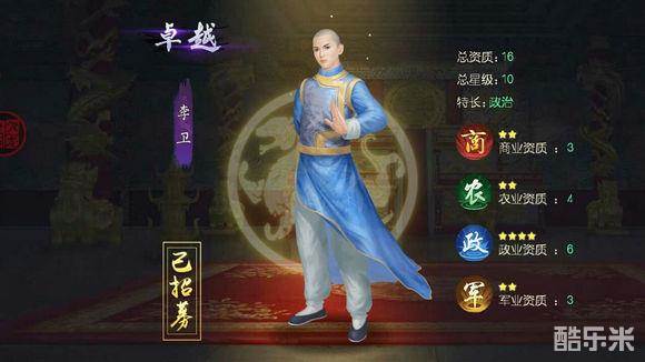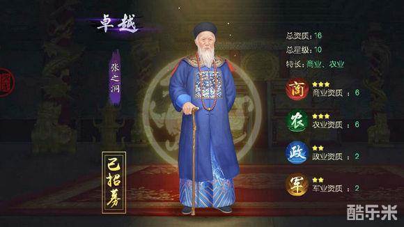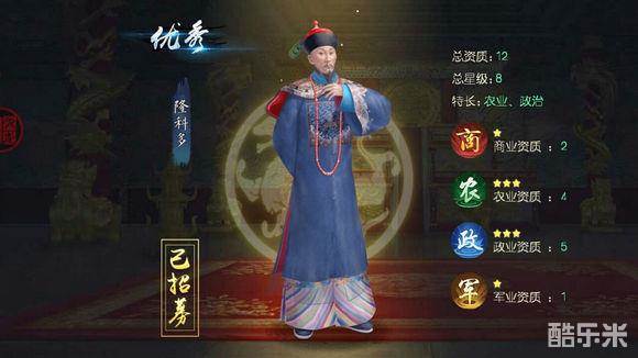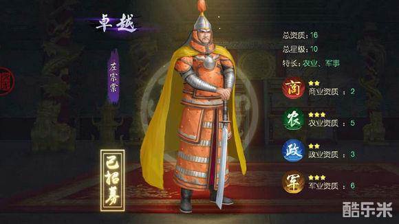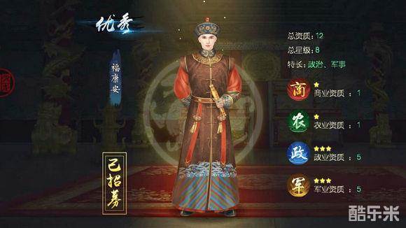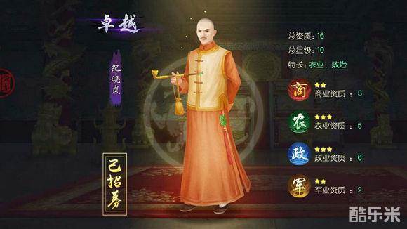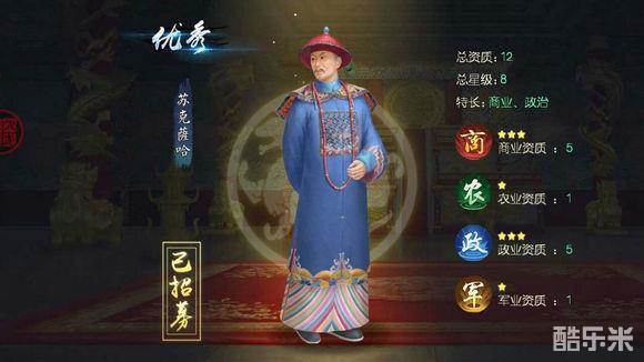 大臣的几项资质评价中政治影响征兵;农业影响粮草;商业影响税收;军事影响战斗力。资质等级 ,由高到低是橙色 ,紫色 ,蓝色 。