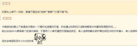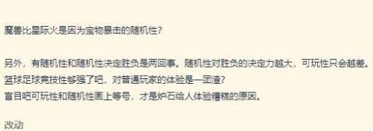 当然,也有很多玩家认为贴主实在小题大做,因为随机性放在任何一款游戏中都是有可能出现的,把控随机性的做法不是简单粗暴地封杀所有影响平衡的机制,而在于提供一个将随机性囊括其中的舒适的对局环境,对于炉石传说来说,通过合理的构筑以及打法来影响概率分部取得游戏胜利才是本质玩法,这也是所有卡牌游戏的对局方式;另一位玩家认为,竞技性和随机性需要一个平衡点,单纯的卡牌竞技游戏将会让玩家完全变为一个运算机器,从而丧失了所有竞技乐趣,诸如足球等传统的竞技项目也正因为高随机性才博得了很多球迷的欢心。