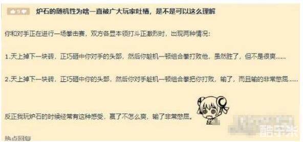 贴主在帖子中谈到了自己对于炉石传说过高的随机性的看法,他将玩家比喻为了拳击选手,而随机性则是一块突然被抛入场中的砖头,,如果我们运气好的话砖头砸中对手的头部,我们便可以乘机以一套组合拿下对手;而如果我们运气不好被砖头砸中的话,对手同样可以以一套组合拳拿下比赛,这样无论我们输了比赛还是赢了比赛都不会太开心。看来贴主对于随机性的看法是秉持着反对态度的呢,认为随机性不仅没有提升游戏性,还在不断磨灭我们的游戏体验。