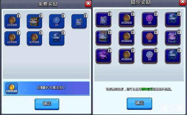 奖励方面同样还是分“免费奖励”和“额外奖励”两个部分,免费奖励共有7个,除了一个传奇宝箱外,其他的看点也就是金币了,不过最终榜单在前50名的玩家可获得10万的额外金币,大家可要加把劲儿了。额外奖励方面就丰富多了,光传奇宝箱就有两个,而且其他宝箱也有很大几率出传奇卡,这次额奖励的解锁宝石只有250枚,奖励如果能全拿下的话,这250宝石可是非常超值的啊。