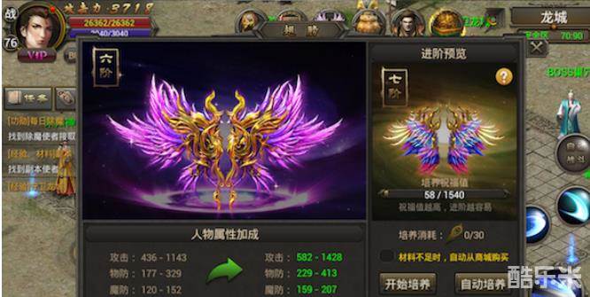 翅膀可以通过培养升阶,培养需使用指定道具或元宝,培养过程中会增加培养祝福值且有几率直升一阶,当祝福值满时必定升阶。