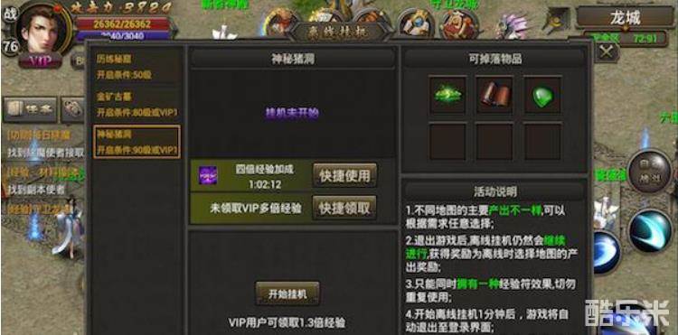 在挂机界面可选择适合自己的挂机地图,同时可以使用多倍经验符,奖励更多。设置完成后即可开始挂机,挂机开始后1分钟人物会自动下线!下线后继续挂机!