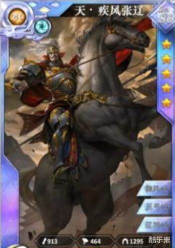 1、疾风张辽,4气的群体冲锋,相当于一个单独的速度BUFF,开场后骑兵沉底一波,也许会很厉害?没有加攻是硬伤。