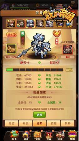 在《我的帝国》中,消耗未进阶的同星级武将,即可对目标武将进阶,全面提升目标武将的属性。当武将进阶到达9阶后,消耗一定材料,还可进行转生,成为真级或神级武将,战力也会大大提高。