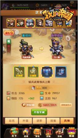 当《我的帝国》中的主公等级达到80级时,可开启兵种系统,不同的武将所携带的兵种也不同,消耗兵符和铜币可升级兵种,当升级达上限时,需通过突破令和铜币对兵种进行突破,能够大幅度增加各项属性和武将的领兵上限。