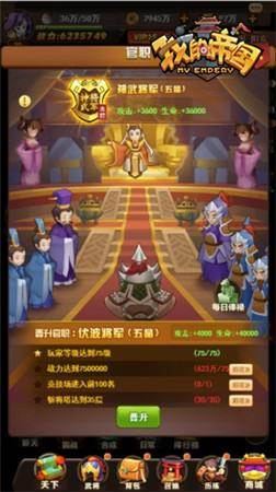 想要提升自身属性,除了武将升阶和兵种突破,《我的帝国》的玩家还可对官职进行晋升。游戏内共设有9个品级的官职,达到不同的条件即可晋升,提高主公的攻击值和生命值。官职越高,玩家每日可领取的俸禄也越丰富。