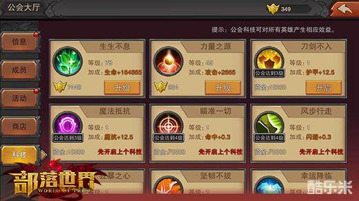 公会等级除了能提升可容纳成员数外,还关系公会商店及科技。公会商店会出售各种装备道具,有非常实用的装备锻造材料以及血精石(装备洗练必需品),公会等级越高,商店可出售的物品越多。公会科技则是全体成员共享增益,公会等级越高,能研发的科技越多。