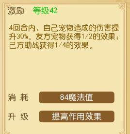 激励技能是兽王的另一个通用技能,这个是非常好用的一个辅助技能,使用后4回合,自己宠物能获得30%的增伤,友方宠物和助战也能获取一定的增伤效果。所以说,这个技能对宠物跟助战都是非常好用的。
