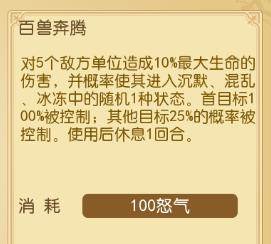 最后都是大招,这个相信大家都是知道的吧?没错,百兽奔腾就是剑系兽王的大招了。这个大招虽然不是全体大招,但能打到5个目标已经是非常不错的了,而且还能对首选目标必定被控制,其他目标也有25%概率被控制,虽然使用后要休息一个回合,但敌方被控制的目标也会被控制2个回合以上哦,虽然这个技能打的伤害不算高,但作为控制的话是非常强势的。