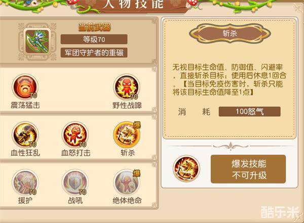 斩杀:无视目标生命值,防御值,闪避率,直接斩杀目标;使用后休息1回合(当目标免疫伤害时,斩杀只能将该目标生命值将至1点)