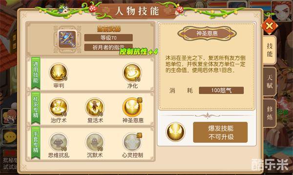 神圣恩惠:爆发技能,消耗怒气释放。复活所有友方倒地单位,并恢复全体友方单位一定的生命值。