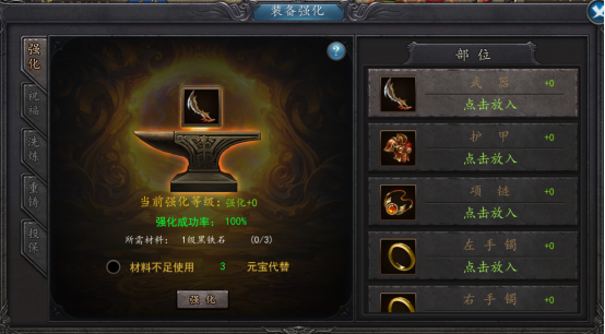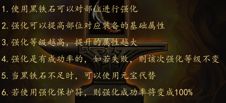 对了,每个部位最多强化到12级,且强化是需要消耗“黑铁石”材料,可以在“矿洞”挖矿获得大量的黑铁石,杀死BOSS后也会掉落。注意黑铁石是有等级区分的,不同的强化等级需要对应等级的黑铁石,若高等级的黑铁石不足,可以去合成系统里用低等级合成哟!