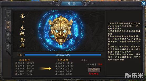 然后打开面具页签,发现面具增加人物的物理攻击、魔法攻击、道术攻击、物理防御、魔法防御,升级需要消耗面具碎片,随着面具等级的增加,所加成的属性越多。