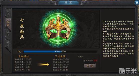 然后打开面具页签,发现面具增加人物的物理攻击、魔法攻击、道术攻击、物理防御、魔法防御,升级需要消耗面具碎片,随着面具等级的增加,所加成的属性越多。