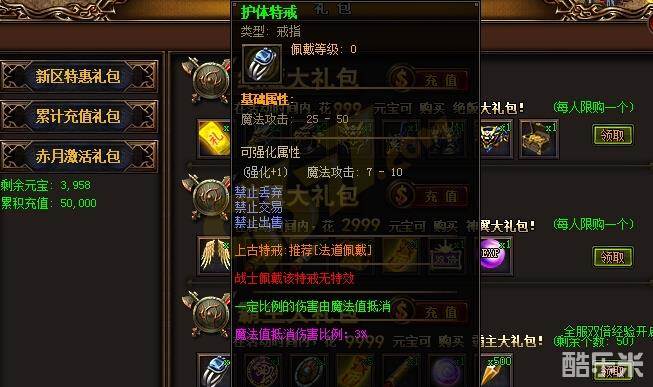 战士职业专属的麻痹戒指佩戴后有一定几率让对手被麻痹;法师职业专属的护体戒指佩戴后受到的部分伤害由MP抵消;道士职业专属的重生戒指佩戴后死亡可原地复活。三大特戒等级越高,所能发挥出来的力量越大。