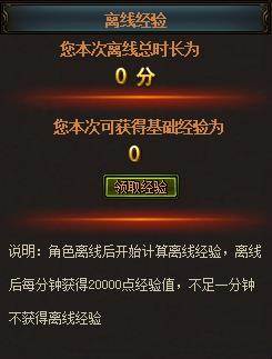 游戏离线经验是从角色离线后开始计算的,离线时间不需一则不能获得离线经验,离线时间达到一以上才开始计算,每可获得20000点经验值。比如,玩家从下午6点开始离线,到第二天早上9点才上线,期间离线了15个小时,共60*15=900,每可获得20000经验,那就是总共可获得20000*900=18000000经验值。玩家要是都没上线,那领取的经验值可就是好几千万了,也够玩家升一级了吧。