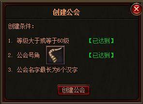 创建公会需要玩家等级大于或者等于60级,并且拥有公会号角,可在元宝商城消耗200元宝购买1个,在猪洞7层的白野猪也有一定几率掉落此道具。玩家们要在创建公会前想好公会名字哦,很好想个有个性又霸气的,会比较吸引其他玩家来加入,公会名字很长为6个汉字,玩家可不要把公会名想得太长哦!