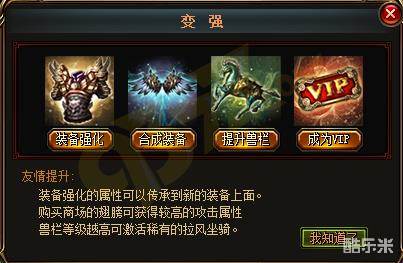 赤月传说变强方法分为四部门,分别是装备强化、合成装备、提升兽栏、成为vip。下面来看看具体的,装备强化可大了提升装备属性,强化需要消耗金币,强化等级越高,消耗的金币就越多,成功几率就越低。装备强十倍不扣金币,只扣除强化次数。