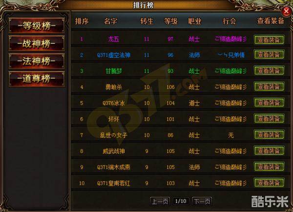 在这四个排行榜中,分别可以查看前100玩家的排名、名字、转生次数、等级、职业、行会等信息,还可以通过查看各个玩家的装备来查看玩家战力,再对比下自身的战力不足,来思考下如何才能增加战力。