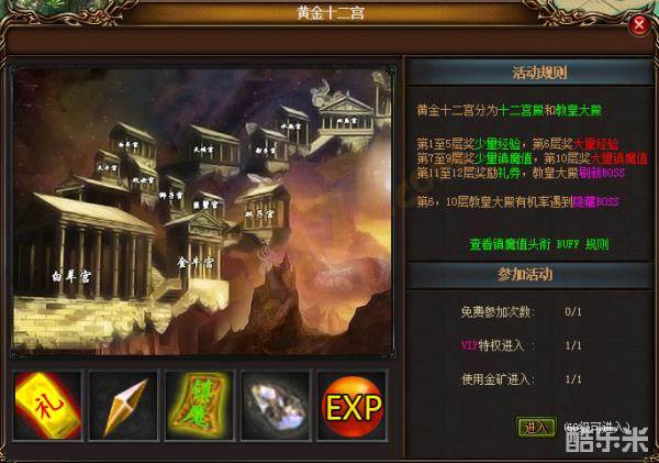 赤月传说黄金十二宫每天可免费参加1次,vip玩家有特权进入1次,使用金矿可进入1次,加起来就是3次,需玩家达到60级方可进入。黄金十二宫分为十二宫殿和教皇大殿,在第6、10层有几率会遇到隐藏boss,教皇大殿中就只有一个boss。