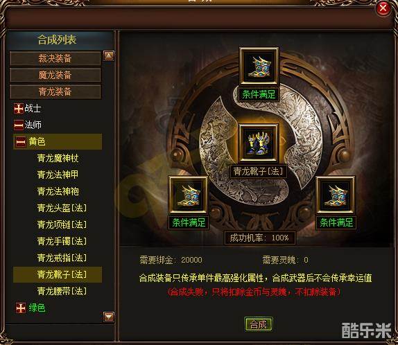 装备合成需要使用3件相同的低等级装备,才能合成一件高一级的装备,比如:3件55级的魔龙特别杖可以合成1件60级的青龙魔神杖。合成装备时还需要消耗绑定金币,可通过完成赤月传说金币任务、运送镖车等获得。有些装备合成还需要消耗灵魄,但不会很多,玩家在游戏中便可慢慢累积。