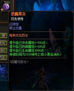 赤月传说恶魔果实,属于稀有攻击药水,使用后可提升自己攻击属性0-500点,防御属性0-200点,生命属性3000点,持续时间为15,死亡或者小退后消失。恶魔果实使用后在打BOSS、PK时都很级有用的,瞬间提升大量的战斗力。