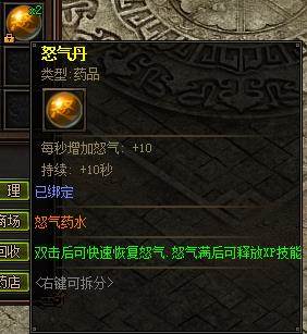 赤月传说怒气丹属于怒气药水类道具,双击后可快速恢复怒气,每秒增加怒气10点,可持续增加10秒,即可增加100点怒气值。当怒气满后,便可释放XP技能,迅速击败小怪。