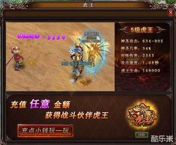 1、充值任意金额便可激活并领取5级虎王一只,其属性为神圣攻击:634-905,神圣几率:34%,攻击速度1.48秒,虎王生命149000。